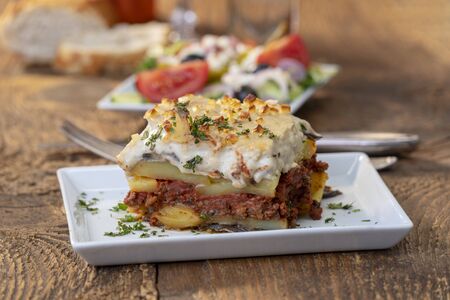 Traditional Greek dish with minced meat - moussaka. Served with fresh vegetables.