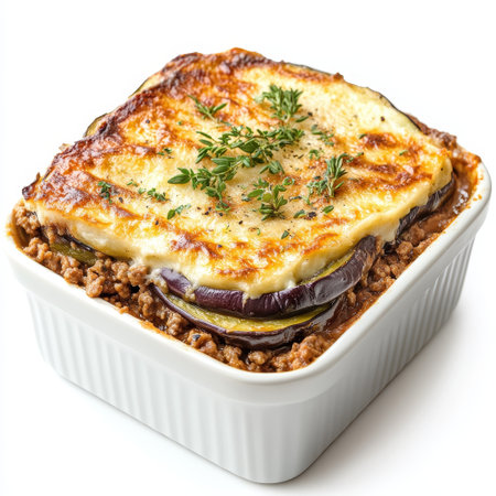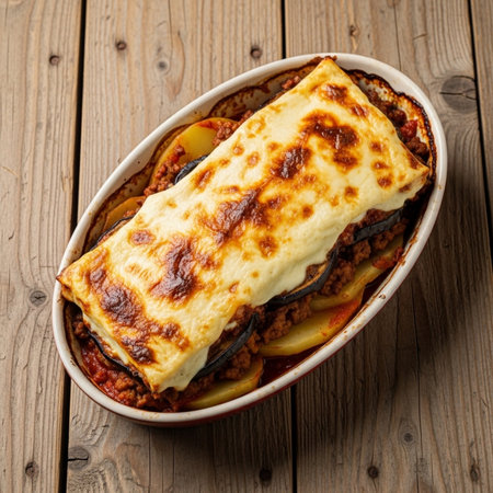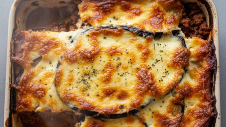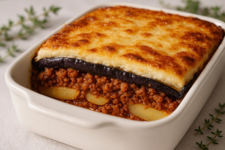 Delicious Greek moussaka casserole with layered eggplant, potatoes, and cheese, perfect for food and recipe content.
