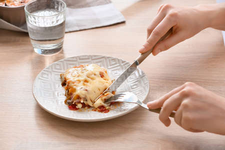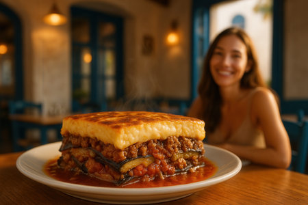 Traditional Greek Moussaka casserole with layers of eggplant and ground meat topped with bechamel sauce served in taverna with happy woman
