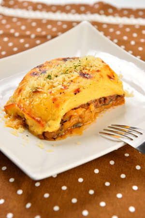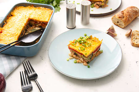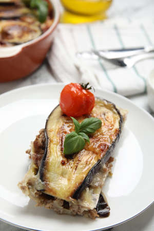 Moussaka with meat, eggplant, tomatoes, potatoes, bechamel sauce and cheese on a white plate. Traditional Greek dish. Close-up.