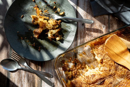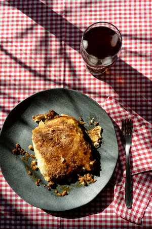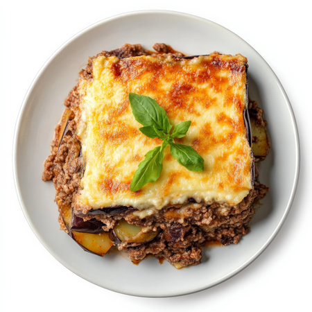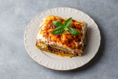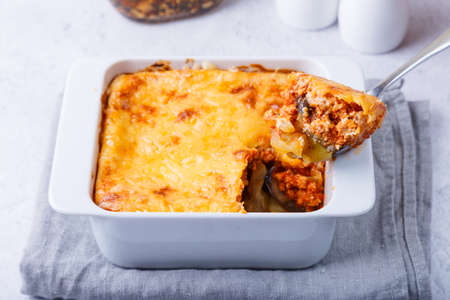 Moussaka baked in a glass casserole and served on a white plate, traditional Greek dish of eggplants, potatoes, minced meat and tomatoes, copy space, high angle view from above, selected focus
