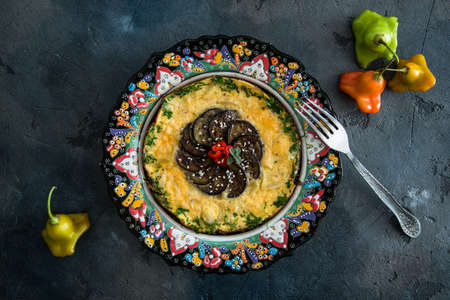 fried omelet with eggplant with onion, Azerbaijan breakfast