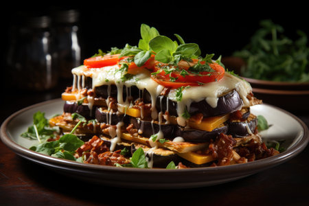 Vegetarian lasagna with layers of eggplant, covered with golden cheese., generative IA