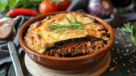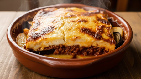 Delectable Greek moussaka baked in a ceramic dish, showing the classic layers of eggplant, minced meat, and rich bechamel sauce. Mediterranean dish is a comforting, homemade culinary delight