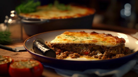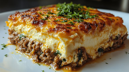 mouth-watering slice of moussaka with crispy edges, revealing the delicious layers of eggplant, beef, and tomato sauce, topped with creamy bechamel sauce, AI Generated