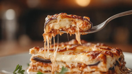 Savor a delicious forkful of warm eggplant parmigiana, showcasing layers of melted cheese and rich sauce, perfect for a comforting meal.