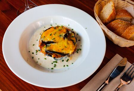 Delicious colorful local food mousaka in a restaurant. Traditional bulgarian cuisine in Bulgaria.