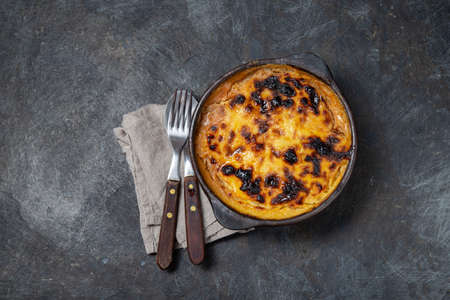 Fresh homemade moussaka in iron skillet on rustic wooden with ingredients. Greek cuisine.