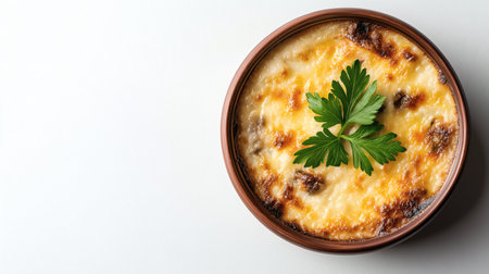 A beautifully baked cheesy dish with a golden brown crust, served in a rustic brown bowl and garnished with fresh parsley. Perfect for a comforting meal.