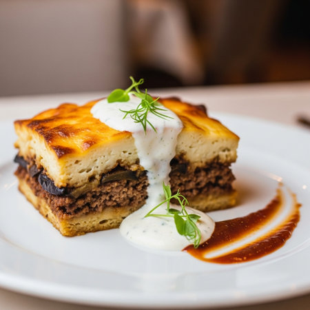 Delicious moussaka with yogurt sauce on a white plate, perfect for Greek cuisine and layered eggplant dishes