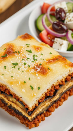 Tasty Greek moussaka layered with eggplant and minced meat, served with a fresh salad on a white plate, ideal for restaurant and food concepts.