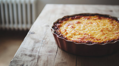 A warm and inviting baked casserole adorned with golden cheese, set on a rustic wooden table. Perfect for meal gatherings or cozy nights in.