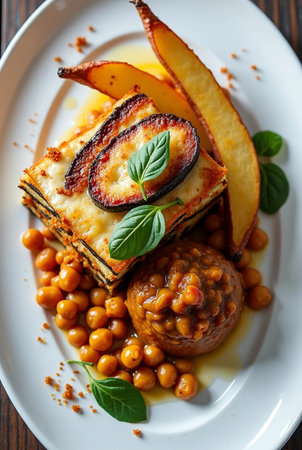 Vegetable lasagna with baked potatoes and chickpeas on white plate