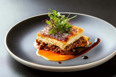 Slice of moussaka, garnished with fresh herbs, sitting on a dark plate with a drizzle of sauce, representing a gourmet culinary experience