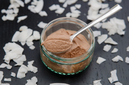 Cacao powder in a glass with a teaspoon next to it On a table surface.
