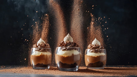 A trio of chocolate mousse desserts in glass jars, surrounded by cocoa powder.