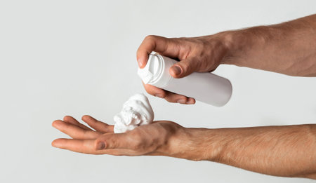 Side view of male hands using shaving foam