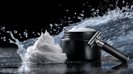 A shaving brush sits next to a jar of shaving cream. Concept of relaxation and self-care, as shaving is often associated with personal grooming and taking care of oneself