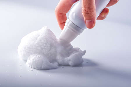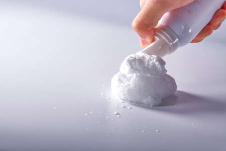 Moment close-up of hand pressing out shaving foam