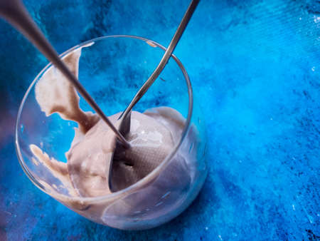 chocolate ice cream in a glass glass on a blue background close-up