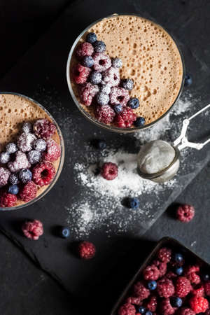 Ryazhenka (fermented baked milk) mousse in glass bowls decorated with fresh berries. Flat lay, top view.