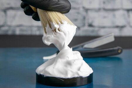 Hand holds brush for applying foam to the beard, foam and dangerous razor on black background. Hairdressing concept.