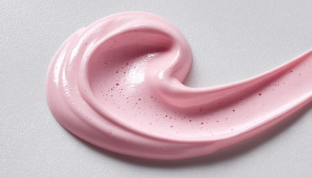 Close up of a smooth, glossy pink cream swirl with a textured surface, creating an elegant and artistic pattern against a white background