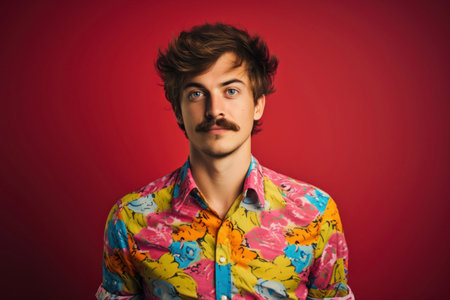 Young man 18-20 years old, with color shirt and mustache posing in studio. Generative AI