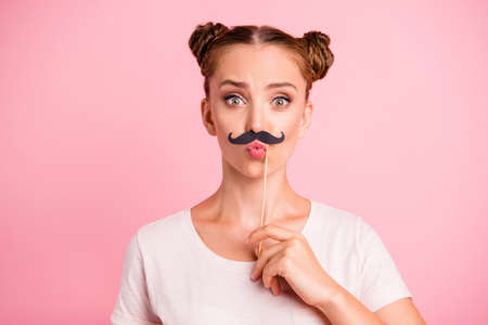 Photo of young girl fooling grimace having fun shows mustache hair isolated over pink color background
