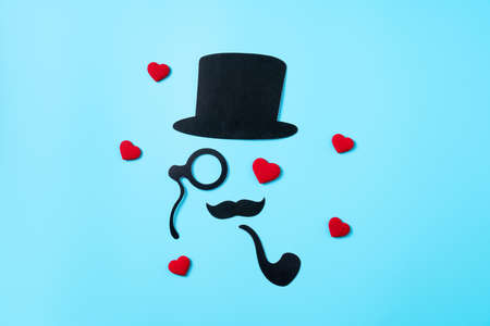 Table top view Happy Fathers day holiday background concept.Flat lay photo booth prop the red heart and mustache on modern rustic grey paper with copy space for creative design world.vintage style.