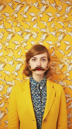Generative AI : young beautiful funny girl with moustache on colored yellow background