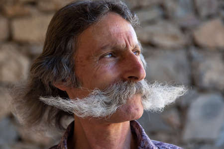 A detailed close-up of a mans face, highlighting his distinctive mustache and beard.