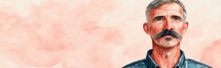 Portrait of a young man with mustache on watercolor background, copy space, AI Generated