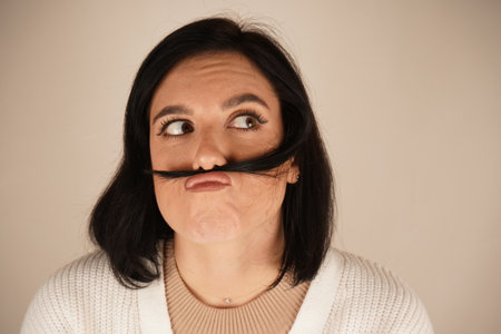 Strands of hair are playfully placed between the nose and upper lip, imitating a playful mustache. The whimsical gesture adds a light and fun touch to the moment. Imitation mustache made of hair.