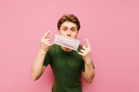 Frightened young man with a shocked face puts a medical mask on his face. Shocked guy puts on a gauze protective mask on a pink background. Coronavirus pandemic. Quarantine. covid-19.