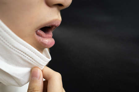 Asian patient coughing without covering mouth,not close her mouth and nose with face mask,pulling the medical protective mask under her chin while dry cough,risk of spread the Coronavirus COVID-19