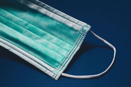Blue medical mask. Surgical used mask with rubber ear straps. Typical 3-ply surgical mask to cover mouth, nose. Procedure mask from bacteria. Protection concept, against coronavirus. Hand holds mask.