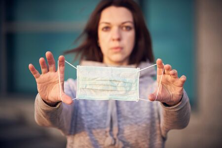 COVID-19, woman showing medical mask for health protection from coronavirus. Outdoor. Pandemic coronavirus concept.