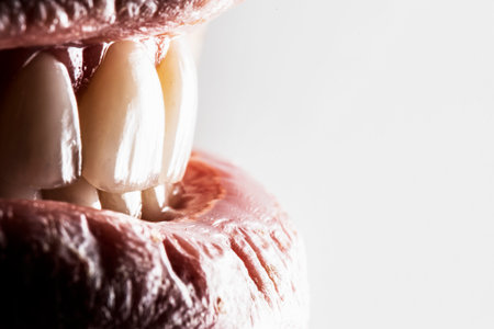 A close-up image of a monstrous mouth with sharp, intimidating teeth and detailed, textured skin. Ideal for Halloween projects, horror-themed designs, or adding a frightening element.