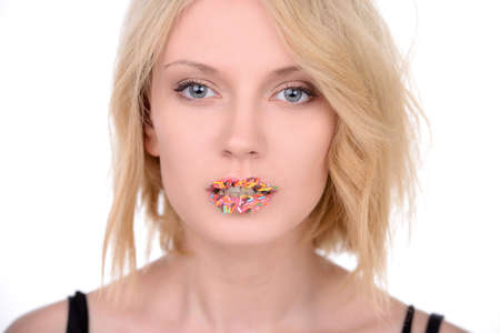 Sweet Lips. Female mouth decorated with candy. Compliments and sweet words. Beautiful mouth of young girl with creative lipstick. Makeup for a Christmas party. Seductive tongue and white teeth smile.