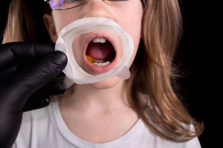 The doctor examines the child's teeth. A child with crooked teeth. Studio photo on a black background.