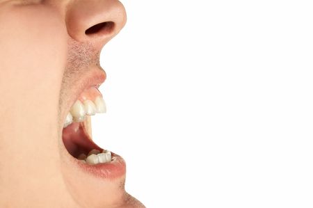 A mans face is seen in the image with his mouth wide open. He is positioned at the far right of the image with plenty of room for copy space. The background is white.
