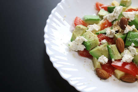 Fresh avocado delicious Mediterranean salad with cherry tomatoes and almonds and feta cheese Parmesan