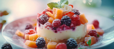 Colorful summer fruit salad topped with mixed berries and mint leaves served as a refreshing dessert