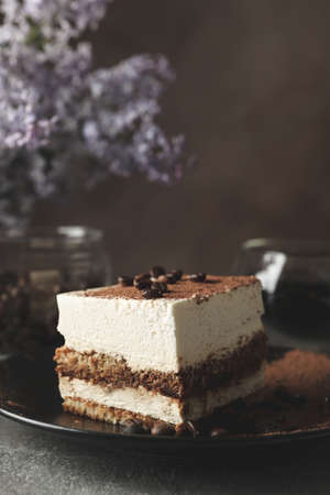 Composition with tasty tiramisu and lilac. Delicious dessert