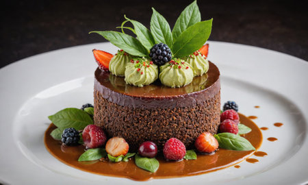 A close-up of a decadent chocolate cake with layers of rich ganache and fresh berries on top, beautifully plated on a white dish, inviting indulgence with every slice.