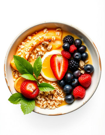 A plate of a fruit salad with berries and mint on it, AI