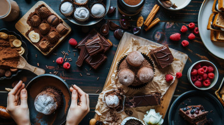A top-down view of a delicious assortment of chocolate desserts, including cakes, truffles, and bars, arranged on a table with berries and spices.