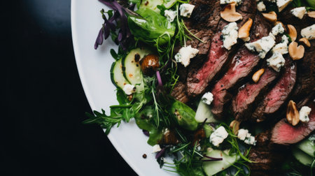 Close-up of a grass-fed steak salad with leafy greens, feta cheese, and nuts, keto dressing on the side.