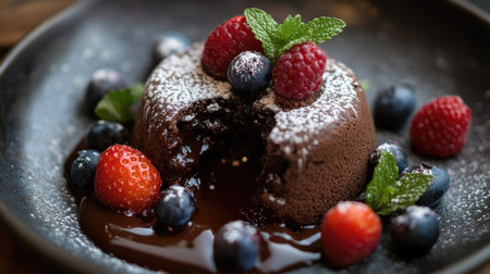 Chocolate fondant with a molten center, topped with fresh berries and mint, presented in a detailed close-up on a plate.